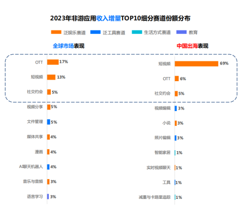 在《2024全球移动应用市场趋势洞察报告》中我们可以看到当前出海发展较好的为泛娱乐赛道,而工具类占比较少,但是泛娱乐及工具类仍为出海首选赛道,目前中国出海品类增长表现整体与全球市场步调一致,主要下载及收入增量均来自泛娱乐和泛工具赛道,因此我们可以认为工具类APP在全球市场中有较为广阔的发展前景和空间。